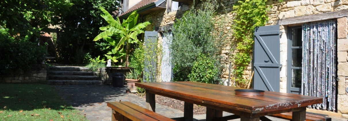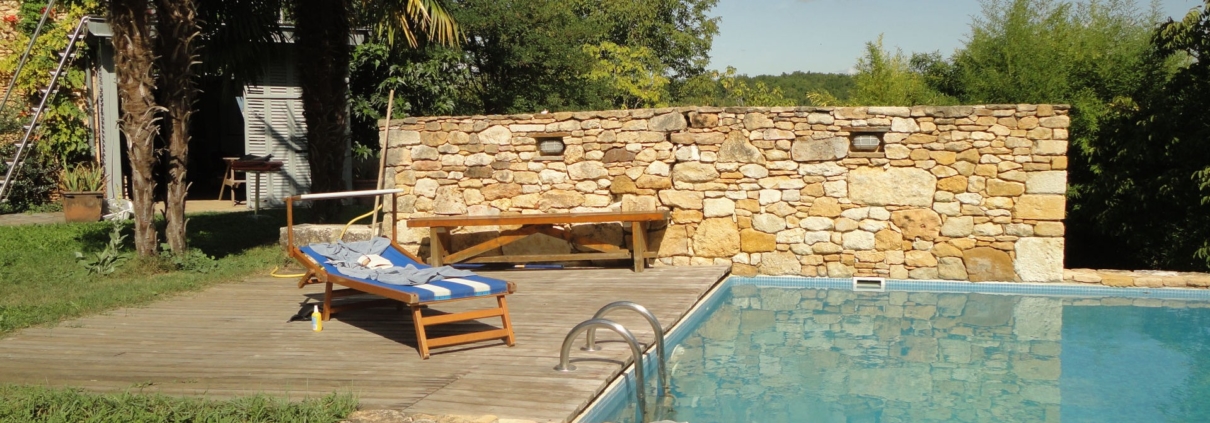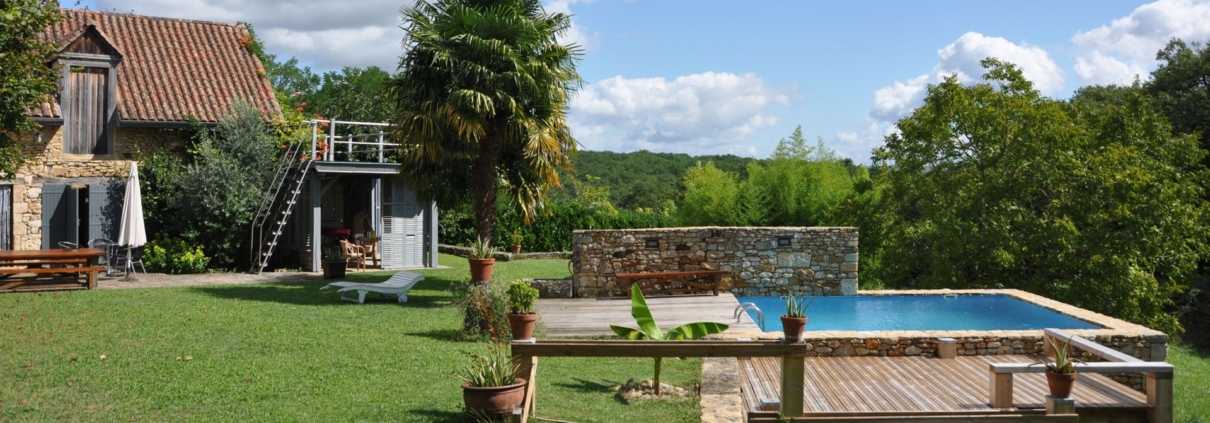 Op het oosten een zomerkamer met wanden van shutters en een terras op één-hoog met een fabelachtig uitzicht op de heuvels richting Brive. Door het mooie samenspel van de begroeiingen en tuinmuren ervaar je een gevoel van beslotenheid naast de ruimte die je beleeft op de terrassen van het zwembad.